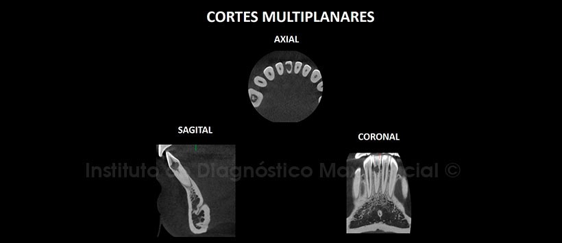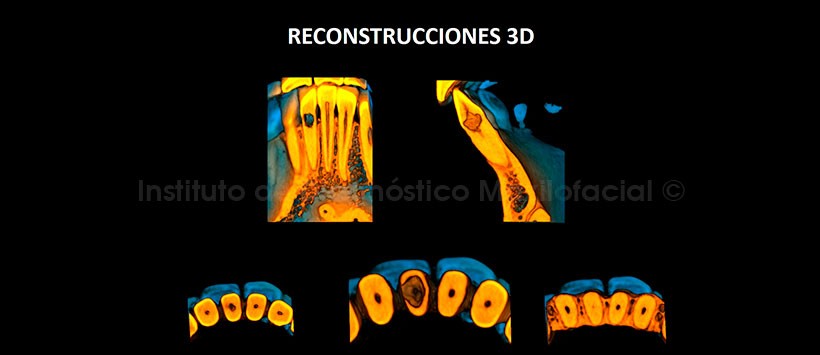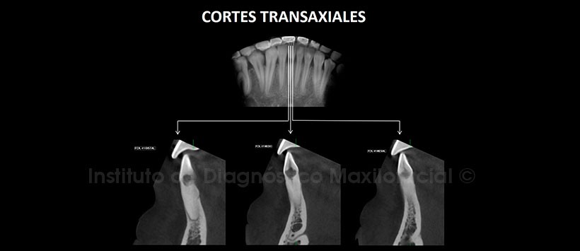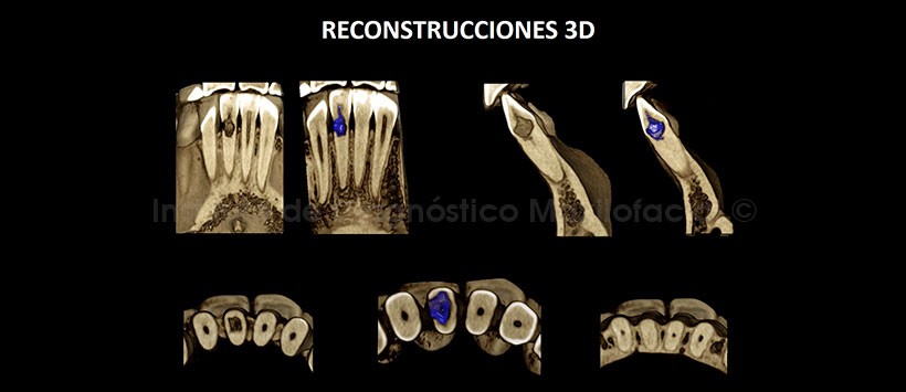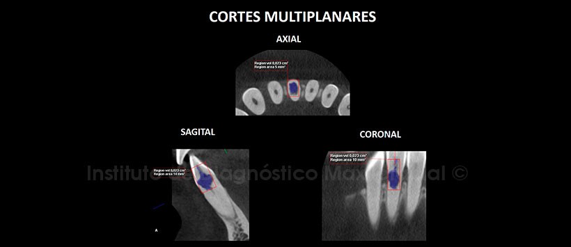 Los estudios por tomografía Cone beam permiten detectar claramente la conformación de la zona afectada, permitiendo determinar la afectación de estructuras, así como incluso las dimensiones en volumen de la zona de reabsorción.