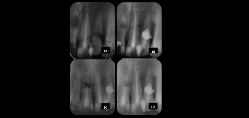 Figura 1: A) Radiografía preoperatoria; B) Revisión de un año de la pieza 22; C) Postoperatorio del diente 11 lleno de MTA; D) Nueve meses de revisión después de la cirugía del diente 11