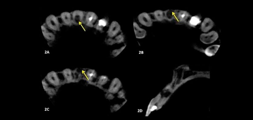 La exactitud diagnóstica de la reabsorción radicular interna se basa en el examen radiográfico convencional, siendo ésta limitada por el hecho de que las imágenes producidas sólo proporcionan una representación bidimensional del objeto tridimensional. La imagen radiográfica es incapaz de revelar la ubicación y la naturaleza del defecto de reabsorción, así como el grosor de la dentina del conducto radicular restante. Además, las estructuras anatómicas podrían superponerse y la imagen podría ser distorsionada. La introducción de la tomografía computarizada de haz cónico (CBCT) en endodoncia ha mejorado el diagnóstico radiográfico y el manejo de las lesiones por reabsorción. CBCT proporciona información como el tamaño, la forma y la naturaleza de la lesión, incluyendo perforaciones de raíz.