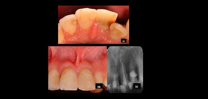 Figura 3: A) Vista palatina de los dientes 11 y 22; B) Vista bucal de la pieza 11 y 22; C) Radiografía periapical tres años después de la terminación del tratamiento