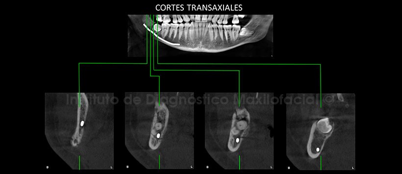 A la evaluación de la tomografía volumétrica de haz cónico (figura 2), apreciamos una fractura ósea la cual compromete ambas corticales óseas. En los cortes transaxiales y tangenciales evidenciamos que dicha fractura condiciona la formación de una leve reacción periostal en la tabla ósea lingual y compromete las corticales del conducto dentario inferior. (Figura 3 y Figura 4)