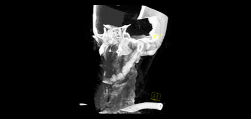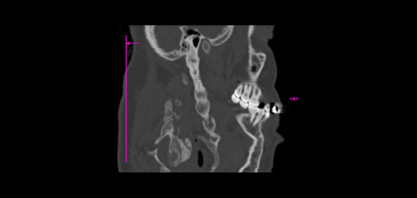 Figura 2. Tomografía de haz cónico (TCHC), es unos de los examenes ideales para determinar la mineralización, el grosor y la angulación de los procesos estilohioideos. En la imagen se muestra una vista sagital donde se visualiza una mineralización con un importante espesor del proceso estilohioideo del lado derecho.