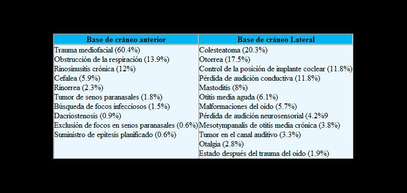 Para la obtención de imágenes en otorrinolaringología, se han establecido diferentes modalidades: por ejemplo, para la representación de estructuras óseas, la tomografía computarizada es ampliamente aceptada. Las dos regiones donde se aplica principalmente son la base del cráneo anterior y la base del cráneo lateral.