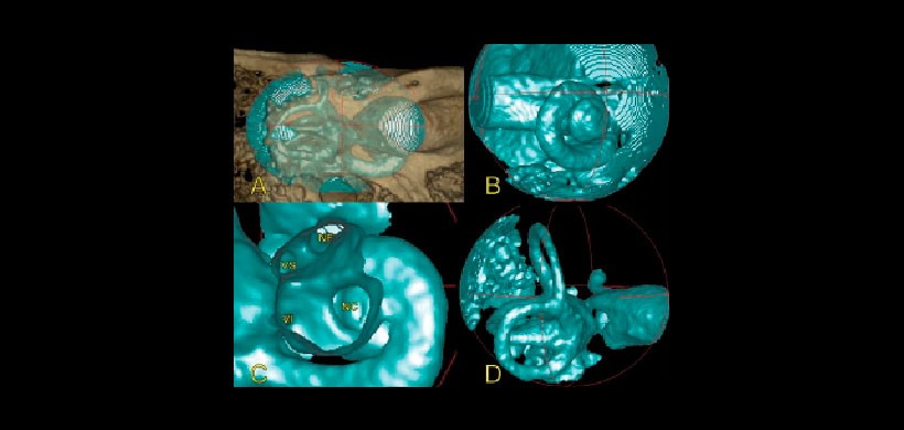 Figura 3: Reconstrucción volumétrica 3D con algoritmo de partes blandas. A: oído interno. B: cóclea. C: CAI (VS: vestibular superior; NF: nervio facial; VI: vestibular inferior; NC: nervio coclear). D: canales semicirculares.