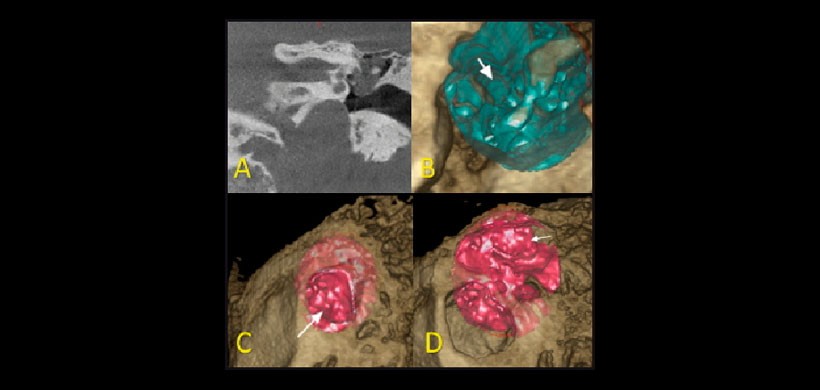 Figura 4: Colesteatoma ático-antromastoideo. A: vista coronal; B: ausencia pared lateral, segmento timpánico VII par; C: reconstrucción 3D algoritmo partes blandas, otoscopía virtual; D: ocupación del antro mastoideo.