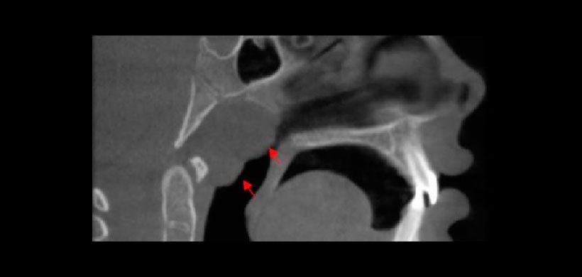 Figura 5: Aplicación de la TCHC en el diagnóstico de obstrucciones de las vías aéreas. En el presente caso se muestra el aumento de tamaño de la amígdala adenoidea ocasionando una obstrucción de la vía aérea (nasofaringe)