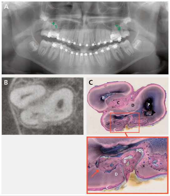 Signos claros de anquilosis en CBCT (B) y en corte histológico correspondiente (C).
