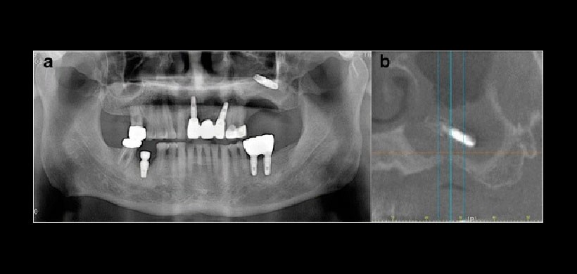 El desplazamiento de los implantes dentales hacia el seno maxilar es raro, pero se produce principalmente en pacientes con neumatización severa del seno maxilar y / o deficiencia del proceso alveolar. Algunas complicaciones como la infección de los senos paranasales y la formación de la fístula oroantral pueden ir seguidas del desplazamiento de un implante dental. Por lo tanto, el implante desplazado debe retirarse inmediatamente con una intervención quirúrgica y debe considerarse otro plan de rehabilitación.