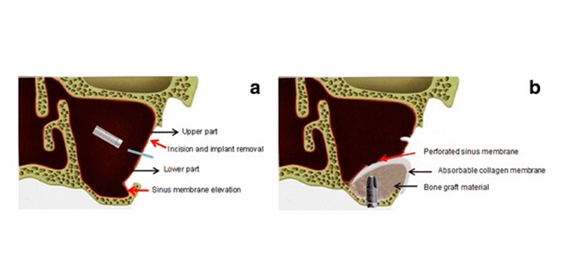 Figura 2: Ilustración que describe la ventana ósea extendida hacia arriba. a) La parte superior se utiliza para la eliminación del implante desplazado y la parte inferior se utiliza para la elevación de la membrana sinusal. b) La membrana del seno perforado se cubrió con una membrana de colágeno absorbible y los implantes se colocaron con injerto óseo sinusal