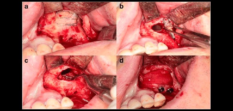 Figura 3: Fotografías intraoperatorias. a) una marca de ventana ósea. b) Extracción del implante desplazado a través de la parte superior. c) Elevación sinusal a través de la parte inferior. d) Instalación del implante con injerto óseo sinusal utilizando membrana reabsorbible y pegamento de fibrina