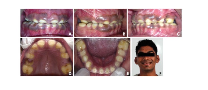 Al examen intraoral se encontró la presencia de una encía pigmentada marrón con un contorno normal (Fig. 1A). También se observó dientes deciduos y permanentes con hallazgos atípicos, así como múltiples caries (Figuras 1A-E). Muchos de los dientes permanentes faltaban, y los dientes erupcionados estaban ampliamente espaciados, con una decoloración de color marrón amarillento (Fig. 1A). La capa de esmalte estuvo ausente clínicamente y el desgaste post erupción de los dientes fue evidente (Figuras 1D-F). Los incisivos centrales superiores exhibían una forma semilunar y los molares tenían superficies oclusales planas (Figuras 1A, D y E). La atrición severa resultó en una mordida colapsada y dimensiones verticales reducidas durante la oclusión (Figuras 1 F)