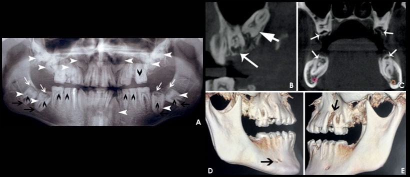La radiografía panorámica y la tomografía computarizada con haz de cónico (CBCT) revelaron múltiples hallazgos. Todos los dientes se vieron afectados, especialmente los dientes posteriores (Fig. 2A). Se observaron múltiples calcificaciones en las cámaras pulpares de los dientes deciduos y permanente(Figuras 2A y B). La radiodensidad diferencial esperada entre la dentina y el esmalte estaba ausente (Fig. 2B). Los dientes impactados presentaron una completa formación de raíz, exhibiendo dilaceraciones y curvatura (Fig. 2A). Los folículos dentales alrededor de los dientes no erupcionados parecían ser hiperplásicos (Figuras 2A y B). Se observó una gran reabsorción de la corona con reemplazo parcial de la dentina reabsorbida por estructuras globulares calcificadas (Fig. 2C).