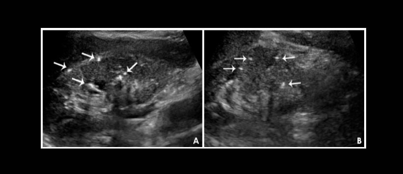 Como este tipo de amelogénesis imperfecta puede asociarse con otras anormalidades metabólicas y de órganos, se llevaron a cabo investigaciones adicionales. Un examen de ultrasonido de sus riñones mostró múltiples focos hiperecoicos en la médula de ambos riñones, lo que sugiere una nefrolitiasis bilateral (Figuras 4A y B). Un análisis espectrofotométrico de orina de 24 horas reveló niveles muy bajos de citrato.