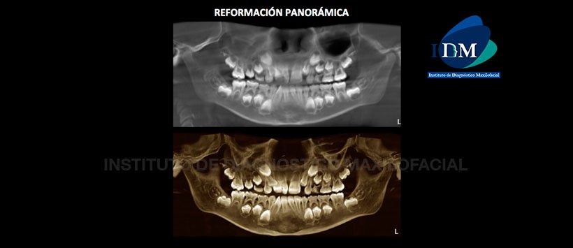 A la evaluación de la reformación panorámica de la tomografía volumétrica (CBCT) (Figura 1) se aprecia aparente alteración morfológica y anatómica de la pieza 1.1 y a los gérmenes dentarios de las piezas 1.2 y 2.2 en evolución extraósea con falta de espacio para su correcta erupción en la arcada dentaria.