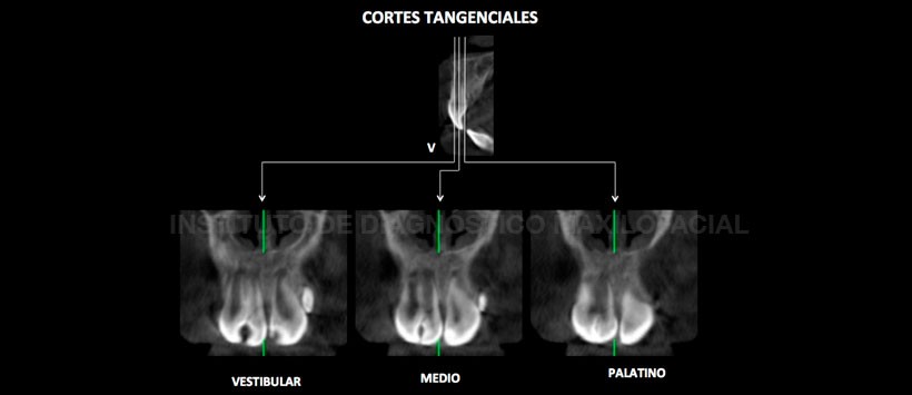 A la evaluación de la tomografía volumétrica en cortes multiplanares (Figura 2) se aprecia contenido isodenso en el total del seno maxilar derecho con obstrucción del ostium; en los cortes axiales (Figura 3), transaxiales (Figura 4) y tangenciales (Figura 5), se observa la alteración morfológica y anatómica de la pieza 1.1 caracterizada por presentar una corona ancha en sentido mesio-distal con presencia de una muesca a nivel de esmalte y dentina que surge de la parte media del borde incisal. Se evidencia una camara amplia con dos conductos radiculares completamente independientes y los ápices abiertos en formación. Por otro lado se aprecia la pieza 1.2 retenida en posición vertical con la corona y raiz próximos a la tabla ósea palatina y a la pieza 2.2 retenida en posición vertical con la corona hacia la tabla ósea vestibular y la raiz equidistante entre ambas tablas óseas.