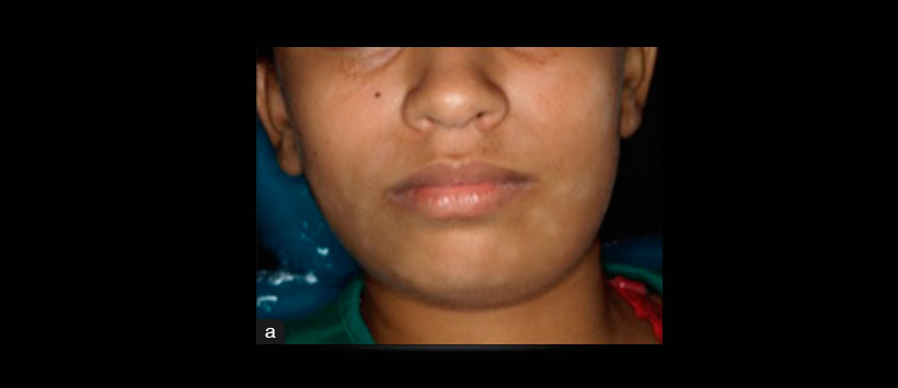 Figura 1: Fotografía extraoral que muestra un aumento de volúmen en la región geniana baja y zona mandibular izquierda en un paciente pediátrico de 12, años y con un tiempo de evolución de 5 meses.