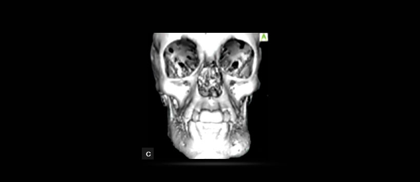 Figura 4: Renderizado 3D de la TCHC que muestra la asimetría ósea a nivel de la zona mandibular izquierda.