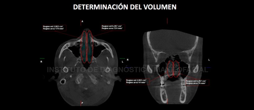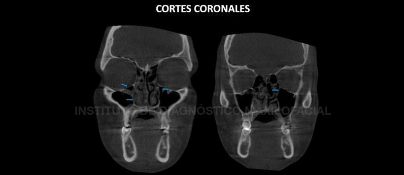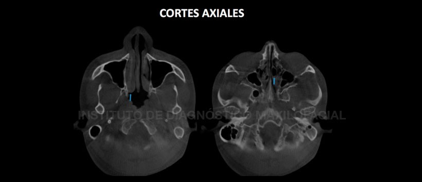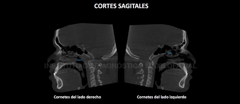 A la evaluación de la tomografía volumétrica (CBCT) cortes axiales (Figura 2), coronales (Figura 3) y sagitales (Figura 4), se aprecia un aumento de la mucosa del cornete medio e inferior del lado derecho que ocasiona una obstrucción del espacio aéreo de la cavidad nasal en comparación del espacio contralateral (Figura 5), por otro lado se aprecia neumatización del cornete medio del lado izquierdo que ocasiona el borramiento del meato superior y compresión del cornete superior del mismo lado; ocasiona el la constricción del ostium del seno maxilar izquierdo (Figura 3). Además se puede observar la presencia de celdillas etmoidales neumatizadas a nivel infraorbitarias, que en el lado derecho ocasiona la obstrucción del ostium del seno maxilar.