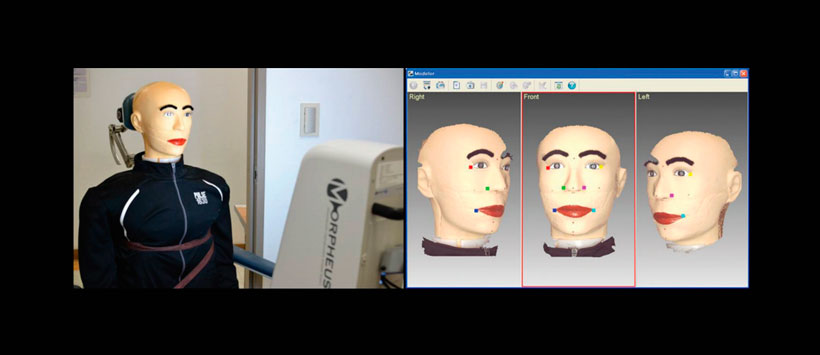 Se adquirieron imágenes del escaneo facial (mediante CBCT) de un simulador  antropomórfico (Figura 1 y Figura 2) que muestra 13 tejidos blandos los puntos de referencia anatómicos se usaron en el estudio. Las distancias entre los puntos de referencia anatómicos en el simulador eran medidas para obtener una referencia y para evaluar la precisión de las imágenes de tejidos blandos faciales en 3D. Las distancias entre los puntos de referencia de la imagen 3D se midieron usando una herramienta de medición de distancia 3D.