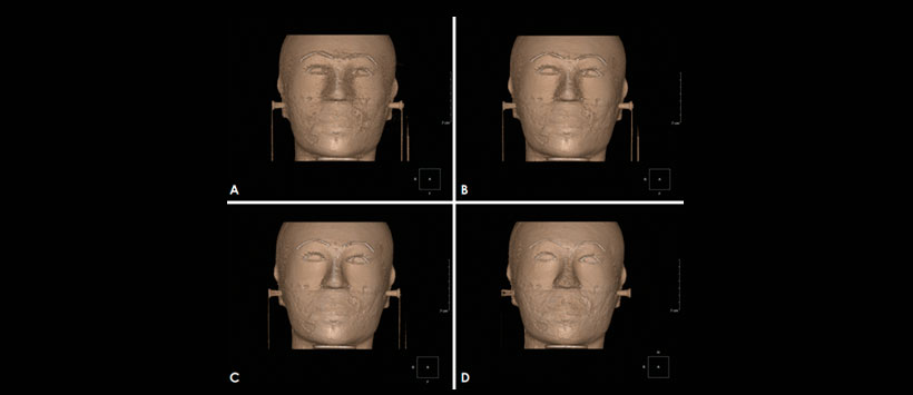 El efecto de los parámetros de escaneo en la calidad de imagen CBCT se evaluó comparando visualmente imágenes adquiridas bajo diferentes condiciones de exposición, pero a un umbral constante. Resultados: la comparación de las mediciones repetidas directas fantasma y basadas en imágenes reveló una buena reproducibilidad. No hubo diferencias significativas entre el espectro directo y las mediciones basadas en imágenes de la superficie CBCT imágenes renderizadas en volumen. Cinco de las 15 mediciones de los escáneres faciales 3D se encontraron significativamente diferentes de sus correspondientes mediciones ficticias directas. La calidad del volumen de la superficie CBCT representada las imágenes adquiridas en un umbral constante variaron según las diferentes condiciones de exposición.