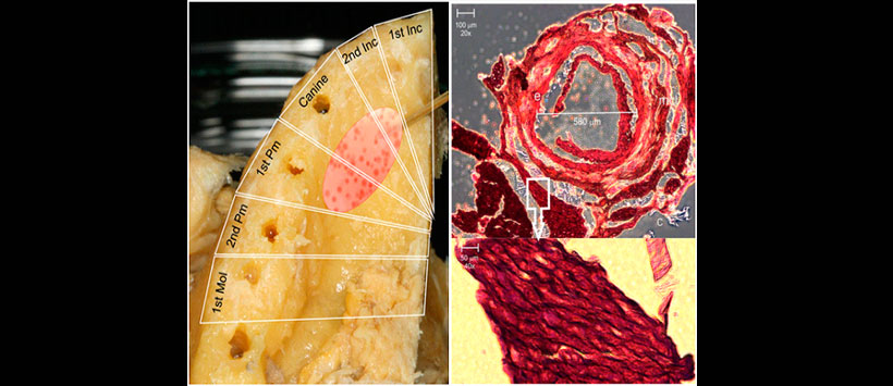 Figura 5: La distribución estadística de la ubicación de salida palatal del aspaa recientemente encontrado «Arteria Kurrekii» se correlacionó con las proyecciones anatómicas de la posición del diente, tanto para la investigación de la cabeza del cadáver humano como de las detecciones en XMIND-TRIUM-CBCT-scans. El análisis histológico de los contenidos de aspaa muestra un vaso sanguíneo con la estructura típica de una arteria con forma redonda y capa muscular-celular gruesa.