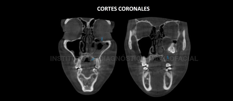 A la evaluación de la tomografía volumétrica (CBCT) cortes multiplanares (Figura 2, 3 y 4), transaxiales (Figura 5 y 6) y tangenciales (Figura 7), se aprecia la presencia de una lesión isodensa localizada en el maxilar superior izquierdo, que se extiende desde la cima del reborde alveolar hasta el piso de la órbita ipsilateral, de límites definidos y bordes parcialmente corticalizados. La lesión ocasiona el ocupamiento del seno maxilar con obliteración del ostium; pérdida del reborde alveolar de zona de pieza 2.7 con aparente comunicación con la cavidad bucal; retención y desplazamiento cefálico de las piezas 2.7 y 2.8; erosión y leve expansión a nivel de la pared postero-lateral del seno maxilar y apófisis piramidal del lado izquierdo.