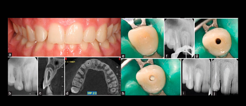 Figura 1: Tratamiento de la pieza 1.2. a) fotografía preoperatoria, b) Radiografía periapical preoperatoria, c) Tomografía computarizada cone beam en vista sagital muestra una completa comunicación entre la invaginación y el tejido periodontal, d) Tomografía computarizada cone beam en vista axial a nivel apical, se puede observar el sistema de la pulpa estrecha en forma de anillo adyacente al tejido de esmalte delimitando la invaginación por esmalte, e) forámen de la invaginación a nivel palatino, f) determinación de la longitud de trabajo, g) acceso conservador para evitar violar el espacio pulpar principal., h) obturación del conducto radicular con MTA, i) radiografía post-operatoria, j) control post endodoncia a los 19 meses.