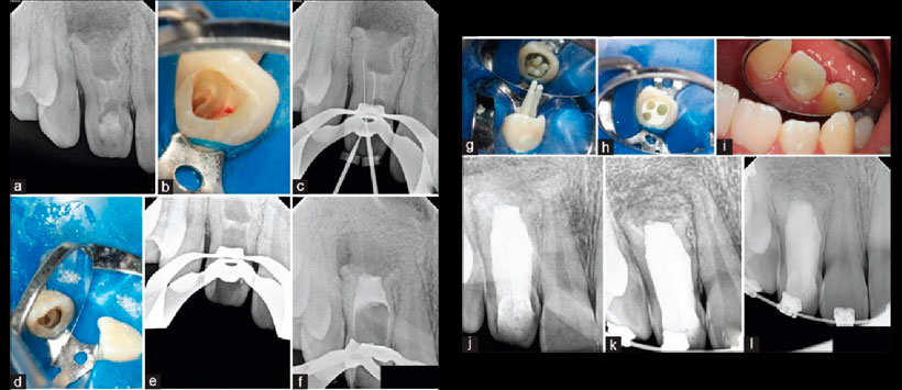 Figura 2: Tratamiento de pieza 1.2. a) Radiografía periapical preoperatoria, b) Foto del acceso inicial al dens in dente que muestra la pulpa vital. C) determinación de la longitud de trabajo, d) eliminación ultrasónica del dens, e) radiografía de eliminación del dens, e) confirmación radiográfica de colocación del MTA en el tercio apical, g) fotografía de la colocación de postes de fibra, h) fotografía de la cementación de los postes de fibra, i) restauración final, j) radiografía post-operatoria, k) control a los 12 meses, l) control a los 24 meses.