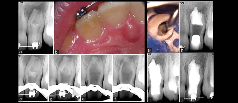 Figura 3: Tratamiento en pieza 2.2. a) Radiografía periapical preoperatoria, b) fotografía con presencia de una cúspide en garra por palatino, c) radiografía que muestra la eliminación del dens en el tercio coronal, d) radiografía que muestra la eliminación del dens en el tercio medio, e) radiografía que muestra la eliminación del dens en el tercio apical, f) radiografía que muestra la eliminación completa de los tejidos invaginados, g) Foto de la colocación de la barrera apical con ProRoot MTA, h) radiografía que muestra la obturación del MTA, i) radiografía que muestra la obturación con postes de fibra, j) control a los 12 meses.