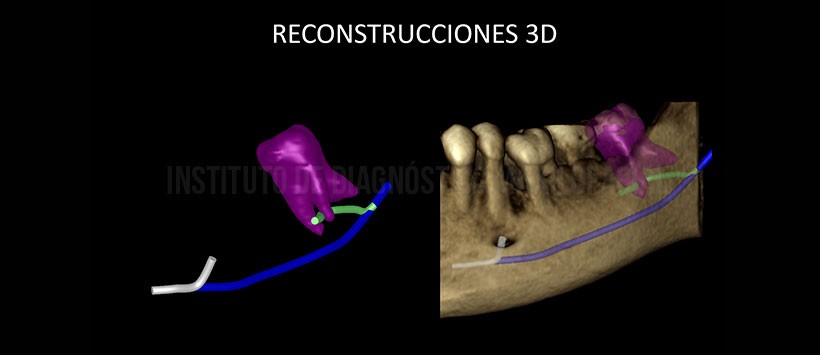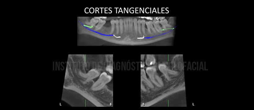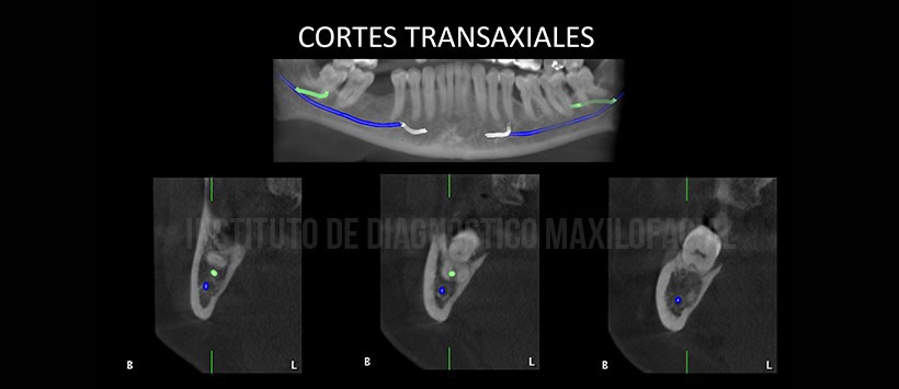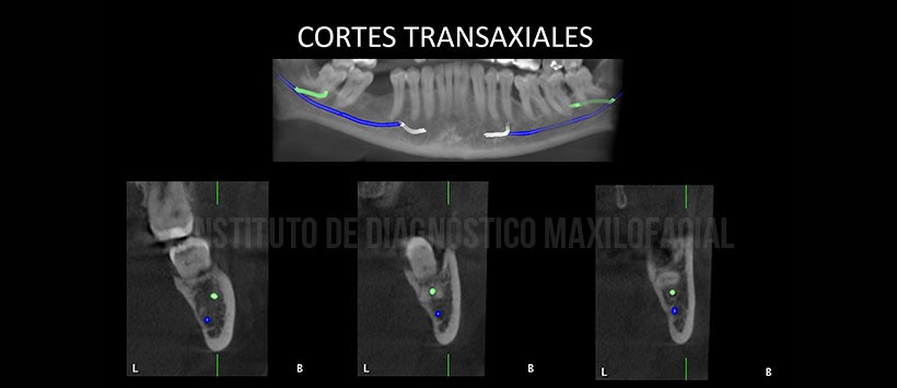 En la evaluación realizada mediante la tomografía volumétrica de haz cónico, se encontró que existe una variante anatómica por parte de ambos conductos dentarios inferiores (bifurcación del conducto sin confluencia). Dichas variantes a su vez tienen un recorrido entre los ápices de las raíces mesiales de las piezas 38 y 48 respectivamente. (Figuras2, Figura 3 y figura 4). También se puede visualizar que el conducto dentario inferior presenta una prolongación hacia la zona sinfisiaria (conducto incisivo)
