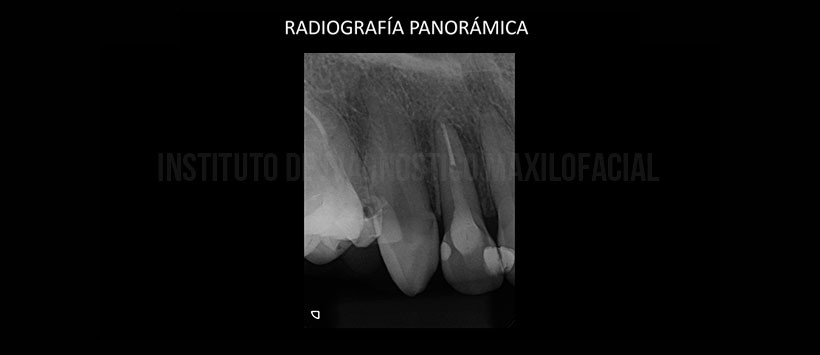 - Proceso osteolítico radicular por mesial, condicionado por la presencia de un conducto lateral.