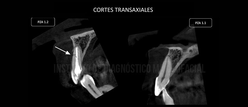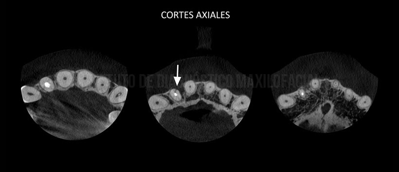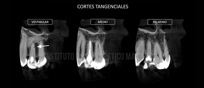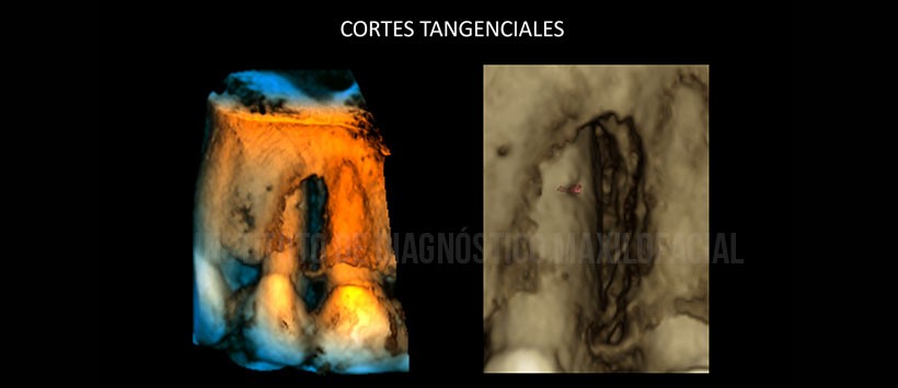 En el estudio mediante tomografía volumétrica de haz cónico, se pudo evidenciar lo previamente descrito sumado a la presencia de un conducto lateral (a nivel del tercio medio radicular) orientado hacia la zona vestibular, que a su vez condiciona la formación de un proceso osteolítico mesiovestibular. (Figura 3, Figura 4 y Figura 5)