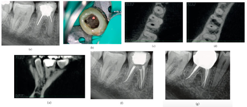 Recientemente, se recomendó el uso intraoperatorio de FOV limitado para la identificación intracamatoria y la localización de canales calcificados; sin embargo, no se informó una técnica clínica para la localización exacta del canal calcificado. En el presente estudio, los puntos de gutapercha se utilizan intraoperatoriamente como marcadores, y la distancia entre el marcador y el orificio del canal de patente se calcula en todos los planos del espacio. También se presenta un caso donde se realizó la misma técnica, pero no todos los orificios del canal pudieron identificarse ya que se borraron.En el presente caso es de una paciente de sexo femenino de 47 años de edad fue remitida para la evaluación y el retratamiento de su primer molar mandibular derecho. El examen clínico no reveló síntomas. Las exploraciones periodontales estaban dentro de los límites normales y no había movilidad. El examen radiográfico reveló un tratamiento previo del conducto radicular con conos de plata y radiolucidez periapical del diente. Los conductos mesiales fueron borrados y no visibles (Figura 1 (a)). El diente fue restaurado con una acumulación de resina compuesta. Se estableció un diagnóstico de tratamiento previo del conducto radicular con periodontitis apical asintomática. Se informó al paciente que el retratamiento convencional del conducto radicular seguido de una corona era la mejor opción. El paciente consintió al plan de tratamiento. Los ultrasonidos se usaron para trepar a lo largo del área del istmo en una posición donde se estimó que estaba el orificio del canal mesiobucal. Después de trepar una ranura de 1 mm de profundidad en la posición mesiovestibular del canal, no se pudo ubicar el orificio. Se colocó un punto GP y se compactó en la profundidad del surco (Figura 1 (b)). A continuación, se colocó una bolita de algodón humedecida con hipoclorito de sodio, y la cavidad de acceso se selló temporalmente con 4 mm de Cavit G. El paciente fue referido para un FOV CBCT limitado. La vista axial de la CBCT reveló que el canal estaba ubicado 0.5 mm bucalmente al punto GP, y la calcificación era evidente (Figura 1 (c)). Además, el canal parecía estar patentado 2 mm apicalmente al punto GP (Figura 1 (d)). La vista sagital de la CBCT reveló que el orificio del canal mesiobucal estaba ubicado a 0.5 mm mesialmente al punto GP (Figura 1 (e)). Luego de la instrumentación, la cavidad de acceso se selló con resina compuesta, y se realizó una radiografía postoperatoria (Figura 1 (f)). El paciente fue retirado cada año para seguimiento clínico y radiográfico. A los dos años de seguimiento, el diente estaba asintomático y la curación periapical se observó radiográficamente (Figura 1 (g)).