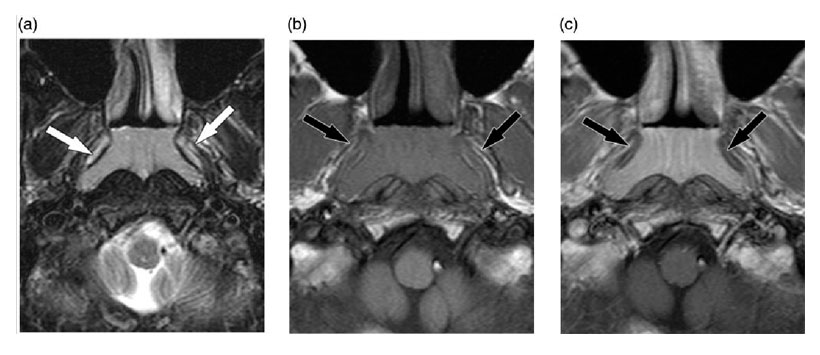 Debido a la involución, el tejido linfático nasofaríngeo generalmente no se encuentra en adultos mayores de 30 años a 40 años de vida. Sin embargo, ocasionalmente se ha reconocido la HA después del año 50 o 60, a ésta edad, la diferenciación entre la HA y las lesiones nasofaríngeas malignas puede ser difícil. Anteriormente, las apariciones de imágenes de resonancia magnética (RM) de HA se han descrito en solo unas pocas series. Además, la frecuencia de HA no se ha informado anteriormente. Típicamente, la HA se manifiesta como una lesión simétrica con franjas y quistes de retención, sin embargo, la HA también puede presentar engrosamiento de la mucosa asimétrica y puede ser diagnosticada erróneamente como neoplasia maligna.