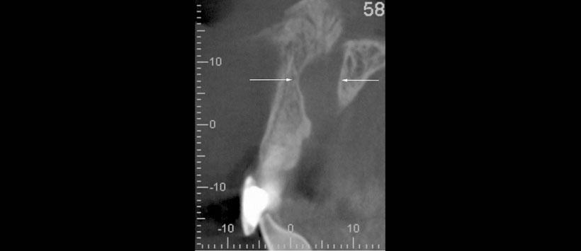 • Figura 3: Imagen representativa de CBCT (Accuitomo 170, campo de visión de 6 × 6 cm, tamaño de vóxel 0,125 mm) en el plano sagital que ilustra un canal nasopalatino con un agrandamiento notable, identificado como signo abultado (flechas)