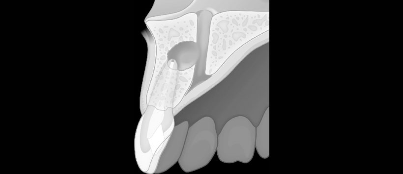 • Figura 4: Ilustración esquemática de una lesión osteolítica apical de la raíz de un incisivo maxilar que muestra la fusión con el canal nasopalatino