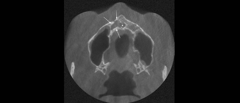 • Figura 5: Lesión osteolítica de forma irregular (flechas) en la vista axial de una imagen CBCT (Scanora 3D, campo de visión 13 × 14,5 cm, tamaño de vóxel de 0,25 mm), que se ha fusionado con el canal nasopalatino (asterisco)