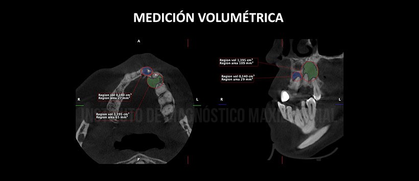 A la evaluación de la tomografía volumétrica (CBCT) cortes axiales (Figura 2), transaxiales (Figura 3) y tangenciales (Figura 4),  se aprecia a las piezas 21 y 23 remanentes radiculares con material de obturación de conductos. Se aprecia dos imágenes hipodensas de forma redondeada y limites definidos asociados a nivel apical de piezas 21 y 23. Lesión de pieza 21,presenta bordes corticalizados, ocasiona el desplazamiento y adelgazamiento de la tabla ósea vestibular, presenta un volumen de 0,140 cm3 (Ver figura 5). La lesión de la pieza 23 es de un tamaño mayor y ocasiona el desplazamiento, adelgazamiento y erosión de ambas tablas óseas, con extensión al piso de fosa nasal, presenta un volumen de 1,395 cm3. (Ver figura 5).