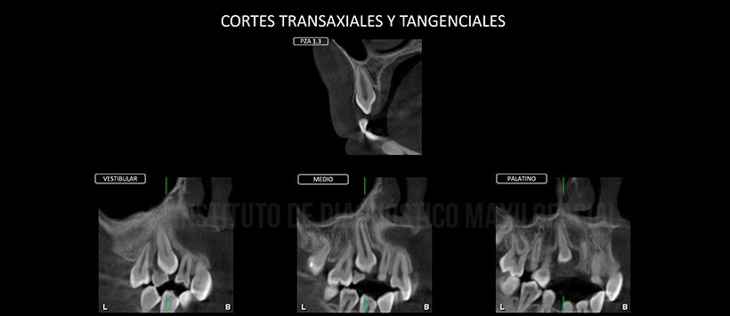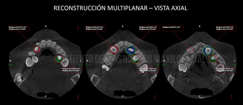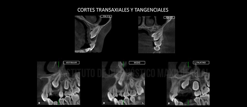 Posteriormente se le realizo una tomografía volumétrica de haz cónico en la cual se aprecia en las vistas axiales (Figura 2) que dicho espacio pericoronario tiene un volumen aproximado de 0.217 cm3 en la pieza 13, 0.623 cm3 en la pieza 23 y 0.645 cm3 en la pieza 25. Así mismo en las vistas transaxiales y tangenciales (Figura 3 y Figura 4) evidenciamos que la pieza 13 esta impactada mesioangulada en relación a la cara distal de la pieza 12, ubicada en una posición equidistante entre ambas tablas óseas y presentando una leve dilaceración del tercio apical hacia distal. La pieza 23 esta mesioangulada, con los límites del saco pericoronario en contacto con los ápices de las piezas 22 y 24 respectivamente; se encuentra en posición equidistante entre ambas tablas óseas expandiendo sobre todo la palatina. Finalmente, la pieza 25 esta en una posición transversa con el segmento coronario y saco pericoronario (aumentado) orientados hacia el tabal óseo palatina.