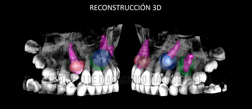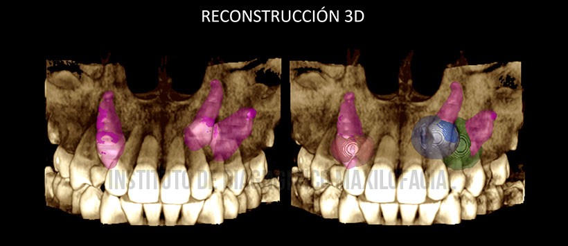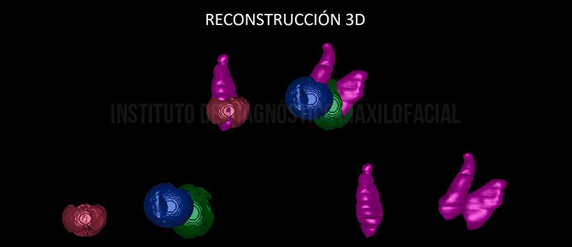 Las reformaciones 3D nos sirve para determinar la ubicación de manera ilustrativa las piezas previamente descritas, así como su repercusión con las estructuras óseas y dentales adyacentes. También podemos segmentar y graficar la relación existente entre el saco pericoronario con su respectiva pieza asociada. (Figura 5, Figura 6 y Figura 7)