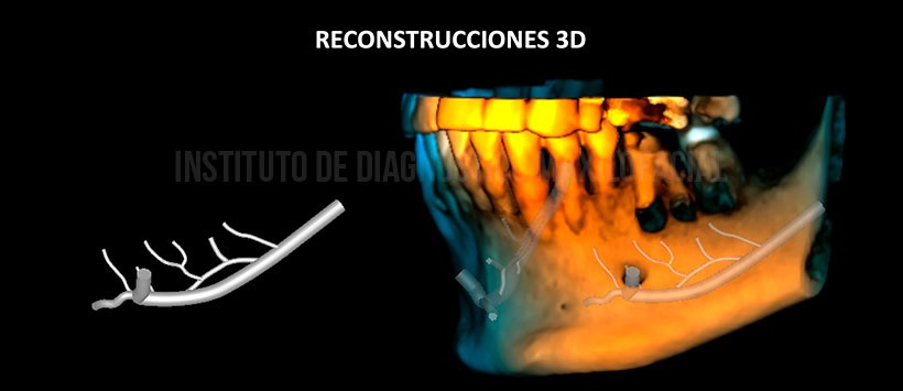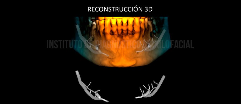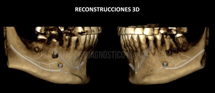 Sin embargo a la evaluación de la tomografía volumétrica de haz cónico se evidencia una variante anatómica por parte de los conductos dentarios de lado derecho e izquierdo. En ambos se visualizan dos conductos adicionales los cuales se proyectan hacia el sector anterior, también se evidencia que las ramas accesorias intermedia presentan una confluencia anterior hacia el conducto principal. Adicionalmente ambos conductos presentan terminaciones accesorias las cuales están orientadas hacia la cima de reborde alveolar. Finalmente cabe mencionar que ambos conductos presentan terminaciones hacia la zona sinfisiaria. (Figura 2 y Figura 3)