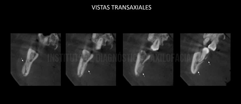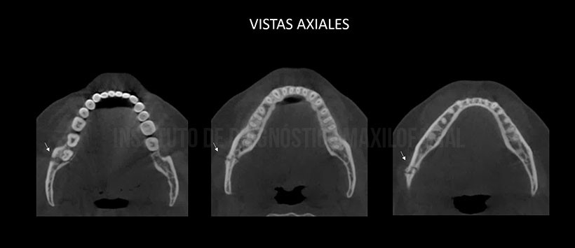A la evaluación mediante la tomografía volumétrica de haz cónico, se confirma que dichos trazos comprometen ambas tablas óseas (vestibular y palatina), la basal mandibular y hueso medular. Así mismo presenta una extensión desde la basal mandibular hacia cima de reborde alveolar (por distal de la pieza 48), adicionalmente se evidencia una aposición ósea en ambas tablas. Finalmente se visualiza que solo compromete las corticales del conducto dentario inferior. (Figura 2, Figura 3 y Figura 4)