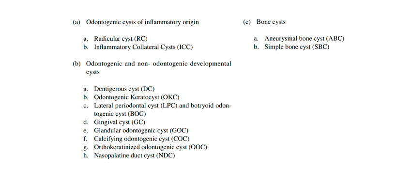 En el área de la patología oral y maxilofacial los quistes de los maxilares se clasifican como verdaderos quistes o pseudoquistes, dependiendo de la presencia o ausencia de revestimiento de epitelio; como inflamatorio o desarrollo basado en su patogenia y odontogenico o no odontogénico según el tejido de origen. La clasificación reciente de la Organización Mundial de la Salud (OMS) de tumores de cabeza y cuello (2017) incluyeron los quistes maxilofaciales y se clasifico como se menciona en la figura 1.
