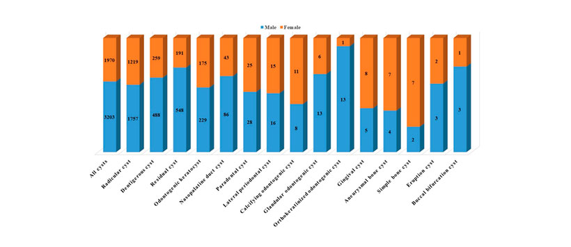 Estos quistes eran más común en pacientes masculinos, con una proporción de hombres y mujeres de 1.6 : 1. La mayoría de los pacientes estaban en la cuarta o sexta década de la vida, con un edad media de 42,3 ± 16,1 años. No hubo predilección de la mandíbula y la mayoría de las lesiones fueron más frecuentes en la región anterior del maxilar, seguida de la región posterior de la mandíbula.