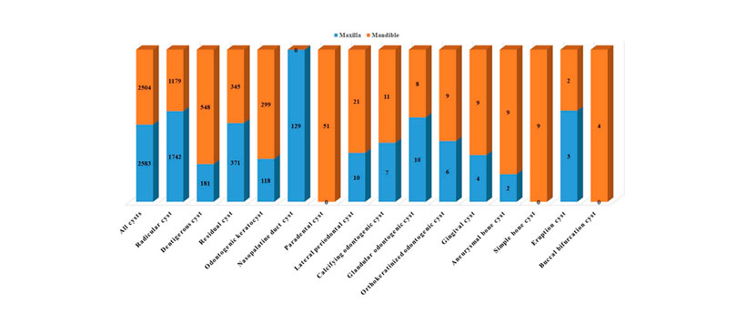 El objetivo del presente estudio es informar las características demográficas y clínicas de todos los quistes maxilares diagnosticados en un servicio de patología oral. 5294 casos de quistes de maxilares diagnosticados durante un período de 38 años fueron recolectados retrospectivamente y clasificado según la última clasificación de Tumores de cabeza y cuello de la Organización Mundial de la Salud. Los pacientes’ El sexo y la edad, así como las principales características clínicas de los quistes se recuperaron de los formularios de informes de biopsia.