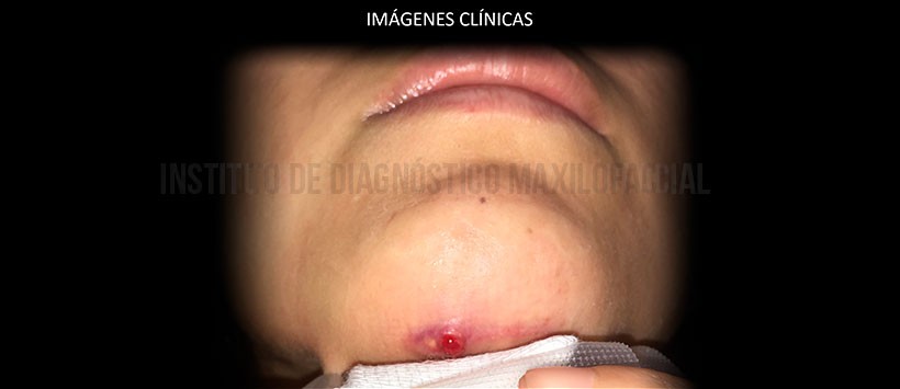 A la evaluación clínica observamos un trayecto fistuloso en zona mentoniana, así mismo se evidencia un aumento de coloración y presencia de exudado sanguíneo y purulento. (Figura 1)