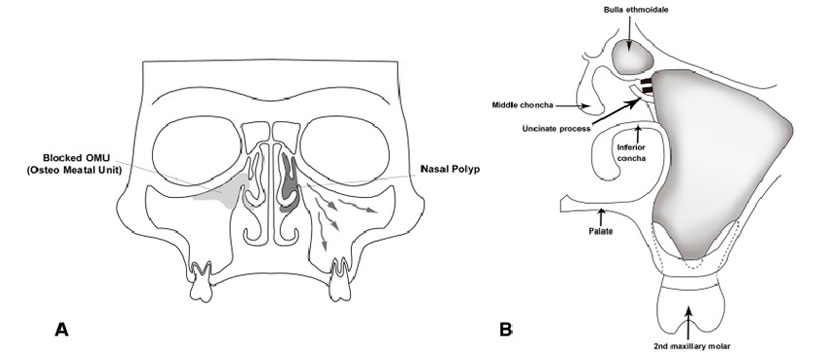 Figura 1: Representación esquemática coronal de los dientes maxilares posteriores con el complejo sinonasal. La actividad de aclaramiento mucociliar normal a través del seno maxilar a la unidad osteo-meatal se muestra como flechas, los pólipos antrocoanal representativos en las paredes del seno superior y medial aparecen oscuros, y los pólipos etmoidales aparecen como asteriscos grises (a). La unidad osteo-meatal que muestra las conchas nasales media e inferior, el proceso de uncinate y la bulla ethmoidale (b).
