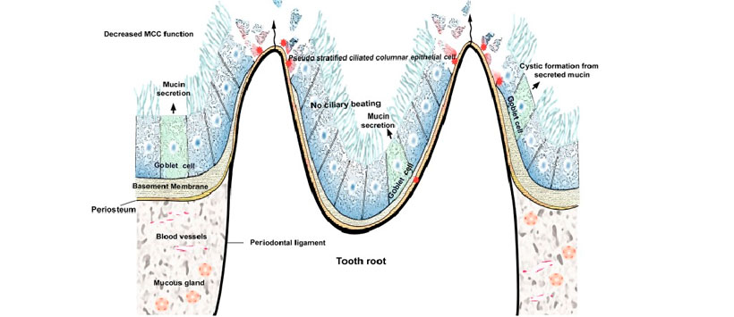 Figura 2: Dibujo esquemático de la descomposición de la función del aclaramiento mucociliar  debido a una infección odontogénica. La barrera mucosa epitelial desregulada se amplía según la gravedad y la duración de la infección.