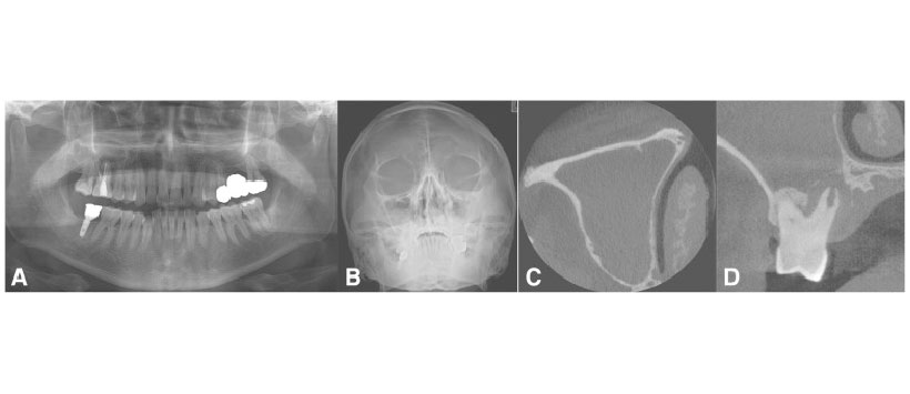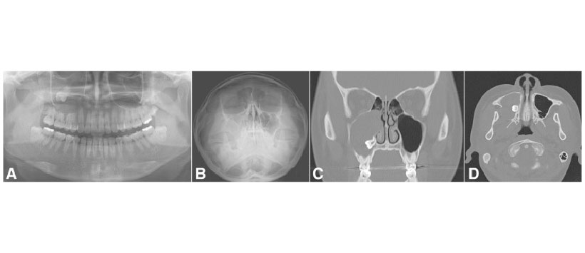 Figura 3: La fístula oronasal crónica después de la extracción del segundo molar con varios puntos de reabsorción ósea alveolar indica sinusitis maxilar odontogénica. Vistas panorámicas preoperatorias (a), de Water (b), TC coronal (c) y TC axial (d)