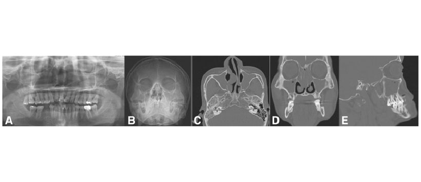 Figura 6: Pansinusitis en ambos senos paranasales que se originan a partir de la infección de la raíz del primer molar derecho. Vista panorámica preoperatoria (a), vista de Water(b), vista axial de la TC que muestra la sinusitis de ambos senos maxilares (c), vista coronal de la TC que muestra una sinusitis completa, incluidos los senos etmoidales y frontales (d), y una vista sagital de la TC que muestra afectación de la lesión patológica radicular del primer molar derecho (e)